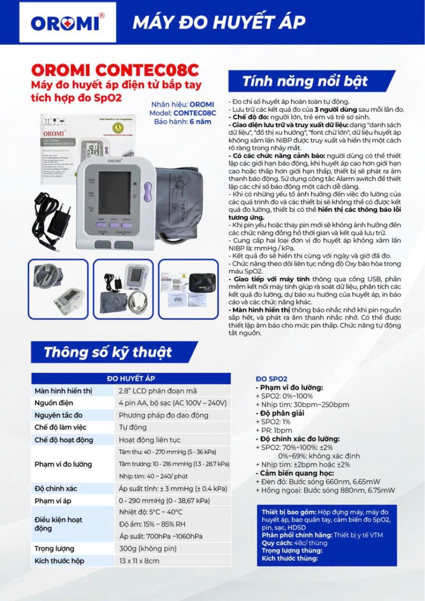 - Máy đo huyết áp điện tử bắp tay Oromi Contec08C (tích hợp SPO2) là một thiết bị y tế hiện đại được tích hợp với chức năng đo huyết áp và nồng độ oxy trong máu. Sản phẩm cung cấp chỉ số nhịp tim, huyết áp chính xác, sai số thấp giúp bạn theo dõi sức khoẻ chính xác ngay tại nhà.