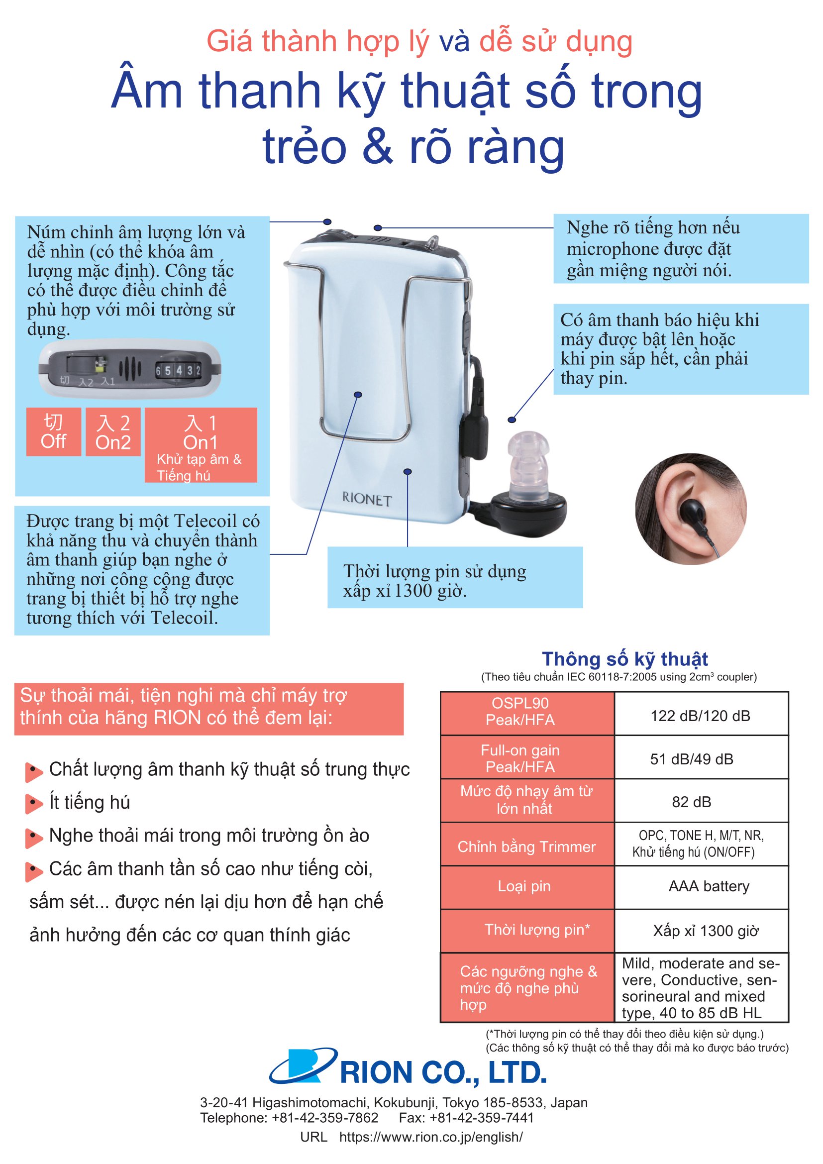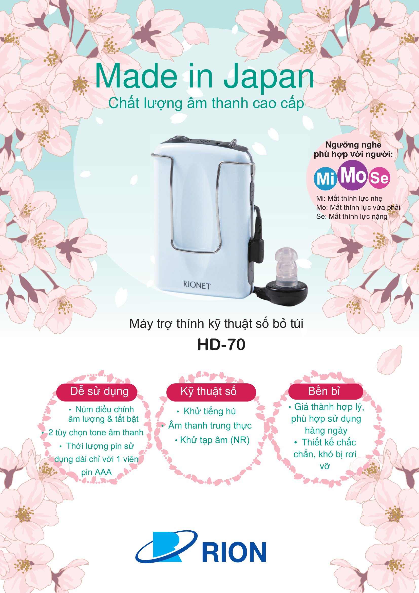 Rionet HD-70 là mẫu máy trợ thính kỹ thuật số nhỏ gọn, bỏ túi dễ dàng. Máy có tính năng khử tiếng hú, công nghệ âm thanh trung thực, hỗ trợ tối đa cho người bị mắc bệnh khiếm thính, người già có thể nghe rõ và trò chuyện bình thường.